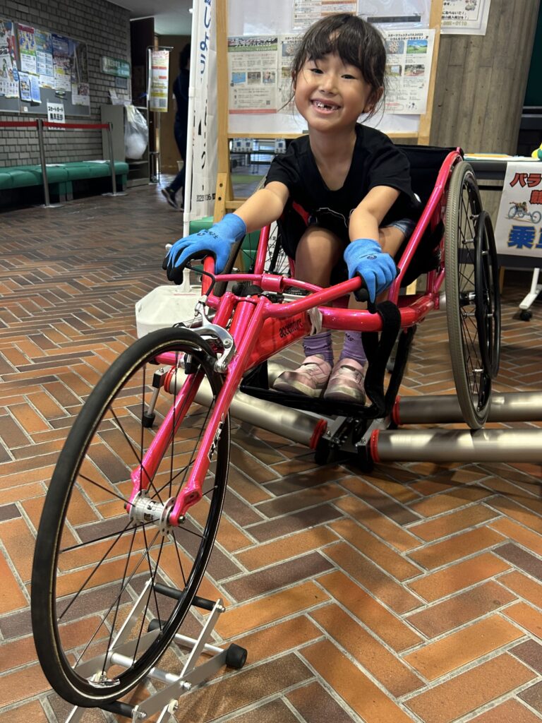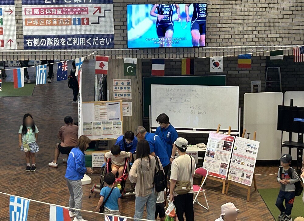 横浜市は、世界トライアスロンシリーズ横浜大会(5月)や八景島トライアスロンフェスティバル(9月)が開催されており、各大会にはパラ部門もあって多くの障害のある方が参加しています。横浜市戸塚スポーツセンターでのイベントでは、より多くの人にパラトライアスロンを知っていただくことを目的に、パラトライアスロンをコンパクトにまとめた動画をご覧いただきながら、実際に選手が使用する競技用車いす(いわゆるレーサー)の試乗体験を行いました。また、今年は聴覚障害者のスポーツ大会である「東京2025デフリンピック」が11月に開催予定のため、同大会の紹介パネルを展示して機運醸成に努めました(デフリンピックについては後述します)。