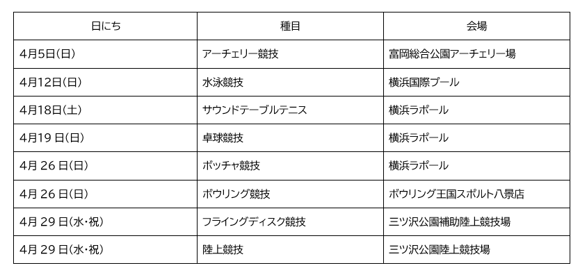 「第25回全国障害者スポーツ大会(青森県)」の横浜市代表選手選考を兼ねた「第31回ハマピック個人競技」が4月より順次開催されます。すでにご承知の読者も多いかと思いますが、「ハマピック」は、正式名称を「横浜市障害者スポーツ大会」といい、横浜市内における最大の障害者スポーツ大会です。個人競技の参加申込は、令和8年2月1日(日)~2月22日(日)までの間に行われ、速報では昨年を上回る数のエントリーがあった模様です。下記に開催日程と会場を記します。基本的に観戦は自由(もちろん無料)となりますので、ぜひ会場に足をお運びいただき、選手たちの精一杯のチャレンジに熱い声援をお願いします。