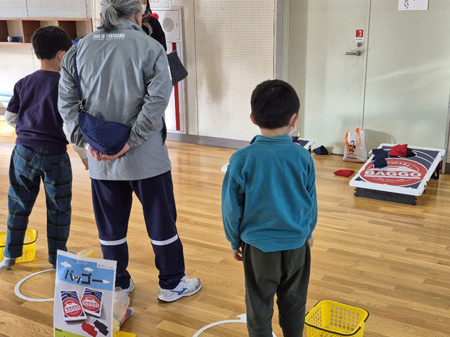まだなじみのないスポーツです。お手玉のようなバッグを穴に投げ入れて競い合います。うまく入れられるでしょうか。