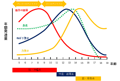 もちろん、各機能の発達は完全に切り離されているわけではありませんが、心肺機能などの「呼吸・循環器系」の発達は神経系より遅れてピークを迎え、さらにその後にホルモンバランスの変化に伴って「筋力」が発達してくるという順序を辿ります。