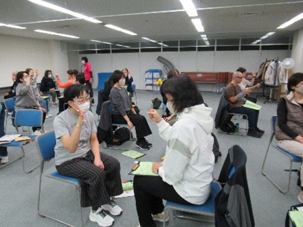 最初は簡単な指示と動きからスタートし、「スパイスアップです!」の掛け声とともに徐々に指示が複雑になり、参加者が混乱して動きを間違えても、講師の明るい人柄が場を盛り上げ、笑いの絶えない講座となりました。