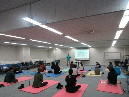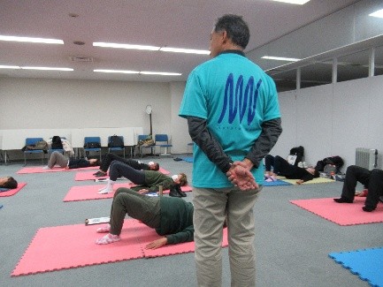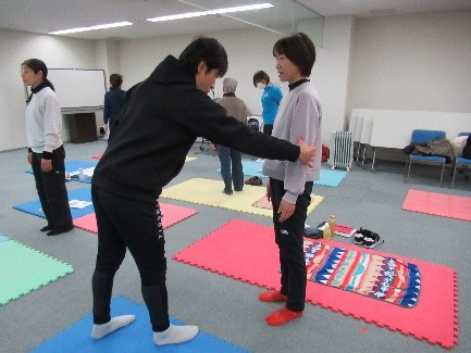多くの時間を占めた実技では、最初にマットに仰向けになり目を閉じた状態で、講師の指示に従って体を動かし、自身の体の床への接地部分を確認しました。