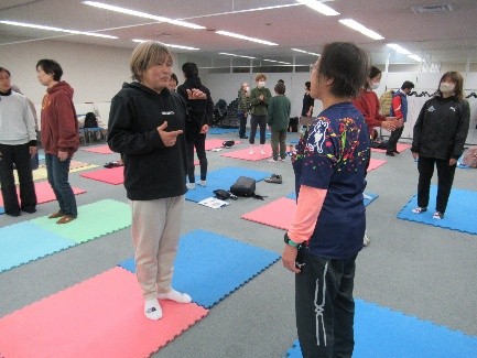 その後講師から大まかな動きが指示され、段階的に「さらにこの部位も動かしてみてください、最初に伝えた動きがスムーズになりませんか」といった動きをスムーズにするコツの声掛けがあり、参加者はこの部位とこの部位は連携して動くものなのだ、というスムーズな動きを体が覚えていくことを身をもって学びました。
