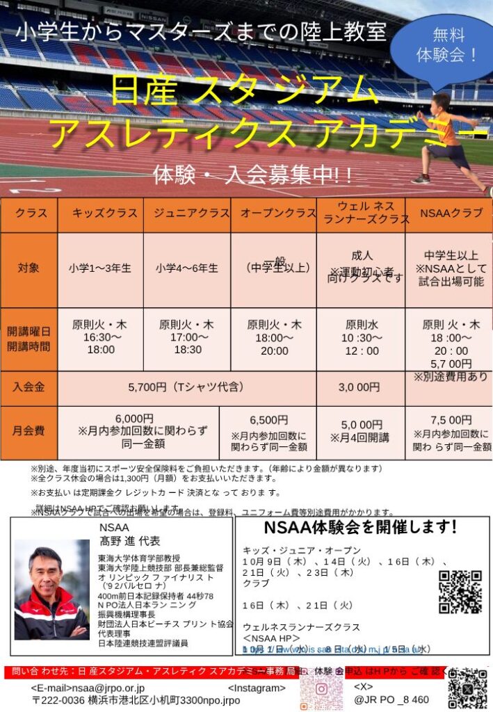日産スタジアムでは、小学生~大人向け陸上教室「日産スタジアムアスレティックアカデミー(通称:NSAA )」を開講しています。