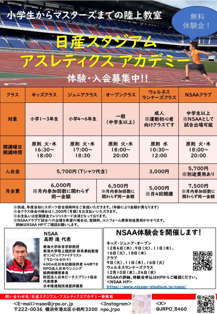 日産スタジアムでは、小学生~大人向け陸上教室「日産スタジアムアスレティックアカデミー(通称:NSAA )」を開講しています。