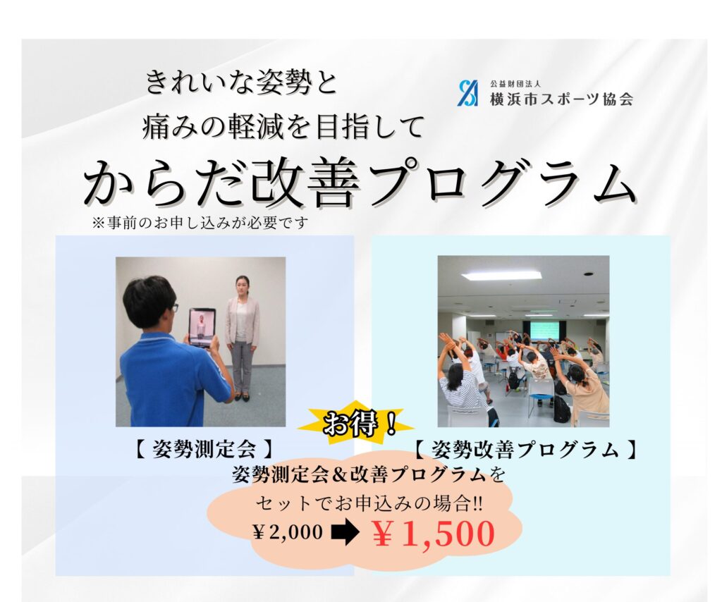 ただし、姿勢測定会と姿勢改善プログラムを両方ご参加の場合は、¥2,000のところ¥1,500(セット料金)とします