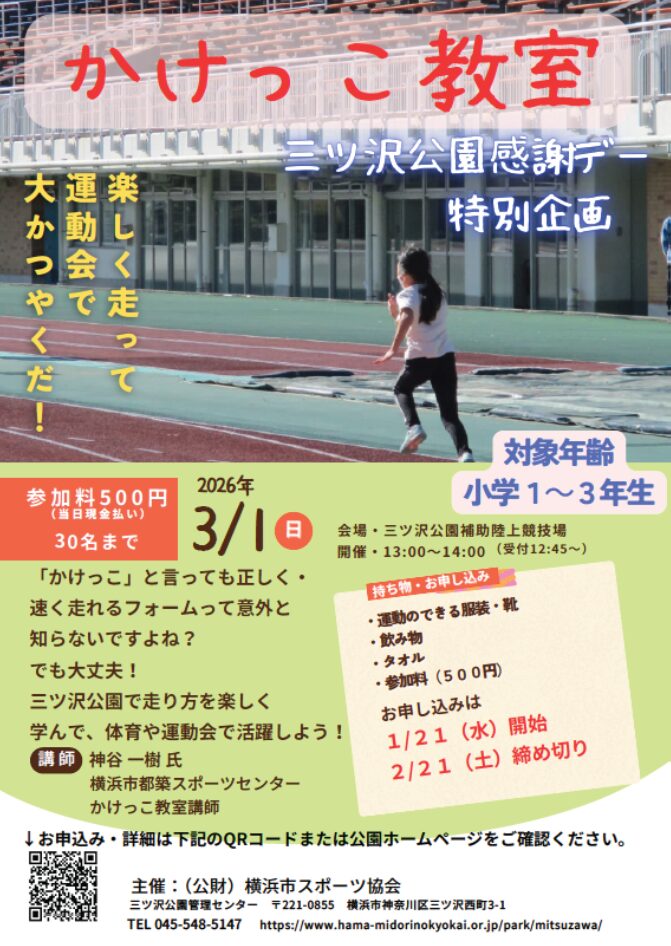 3月1日(日)に開催される「かけっこ教室(第8回三ツ沢公園感謝デー特別企画)」の参加者を大募集中!