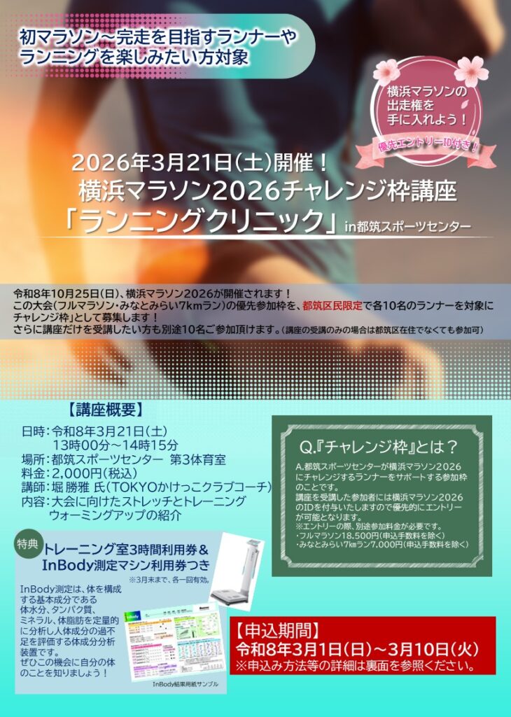 【開館20周年記念イベント】横浜マラソン2026チャレンジ枠講座「ランニングクリニック」