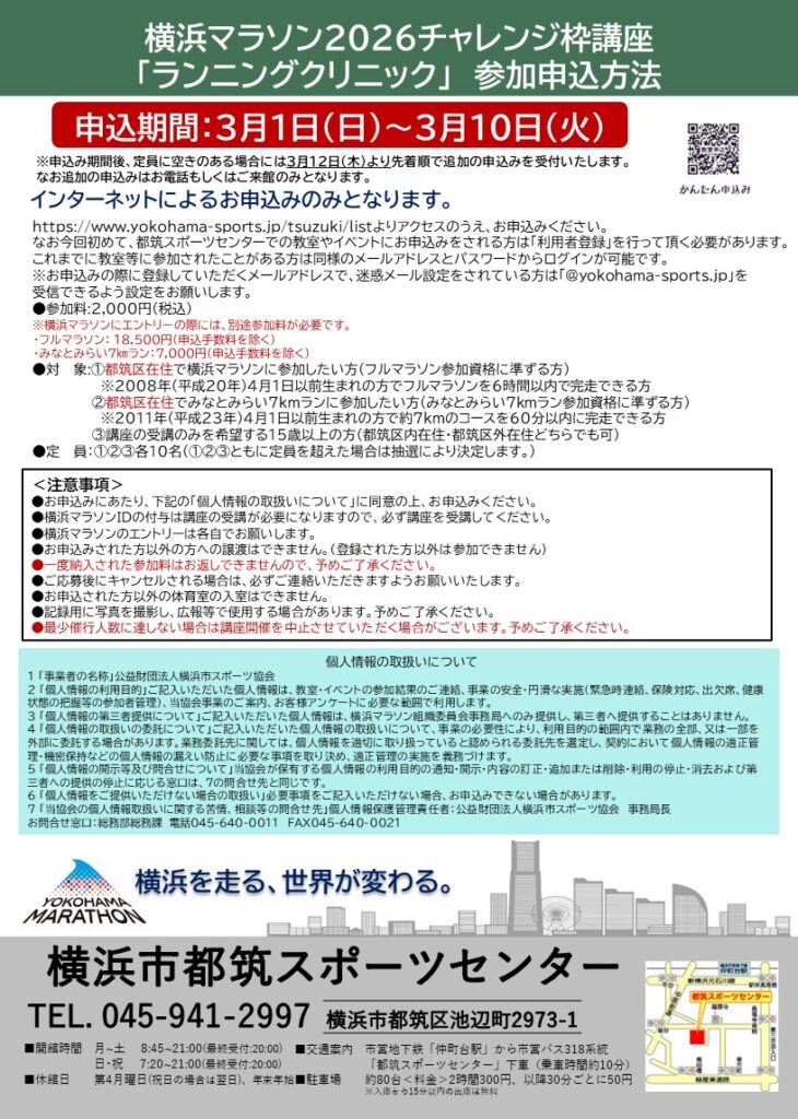 また、③ランニングクリニックのみ受講したい方についても、別途10名募集します(講座のみの受講は、都筑区在住でなくても参加可能です)。